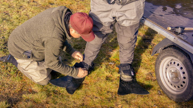 Lars Andersen hjælper John Bond med at tilpasse Force Finns til fod og støvle.