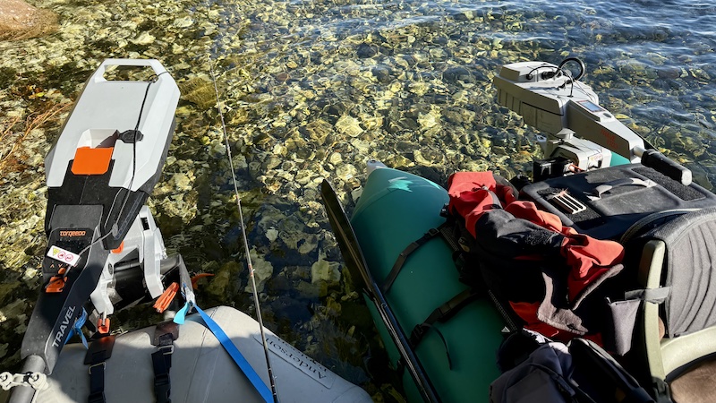 Test og anmeldelse: Anderson Mosqeeto monteret med Torqeedo Travel. Bemærk det specialdesignede motorbeslag og forlængerhåndtaget. Med batteriet placeret på sædet opnås perfekt balance, så jeg kan løfte og bære båden til vandet.